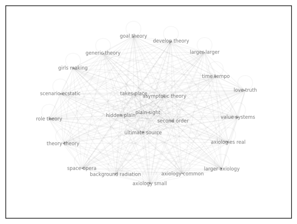 This is again a large and highly (if not completely) interconnected component. In cases like this, graph plotters attempt to minimize a simulated energy represented by the edges; a result of this is that the center-and-periphery pattern is a function of graph structure — many things orbit around “plain sight“, including ecstatic scenarios, value systems and small/common/real and (relatively) large axiologies. Many things there, indeed, have to be produced (but what is “background radiation“ doing there?), i.e. made to appear. But whatever is in plain sight may well be hidden in plain sight; this half-conceals half-exacerbates some fundamental tensions in theory — what to make explicit, how to approach something concrete, whether to venture in the is side of things. By publishing the results of some computations, this essay muddles the water some more.