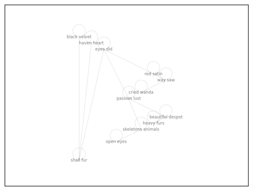 What I find fascinating about the components discovered by the Louvain algorithm is that they seem to identify elements, rather than clusters. Words like “goddess“, “slave“ etc. appear in most components, but some refer to the tactile sensations in the fetish wardrobe (fur, velvet, satin); others spell out dynamic fetish scenes that would not be too out of place on Literotica or PornHub. Call this the “Sacher-Masoch DNA“ or even the “masochome“ — there is enough of a sex imagery industry that this kind of knowledge might prove profitable…