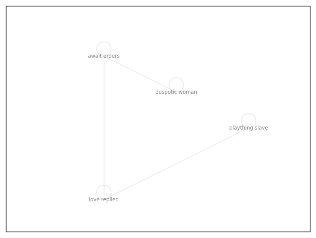 Note that we have to read not only from elements, but also from connectivity structure. In this small component, an axis of love-orders maps to the despot and the slave. It speaks from the strange fact that the abstract (and mostly imagined) dominnace-submission relationship is built on top of romance. I would suggest at this point to scroll back and read from the connectivity structure of the larger components.